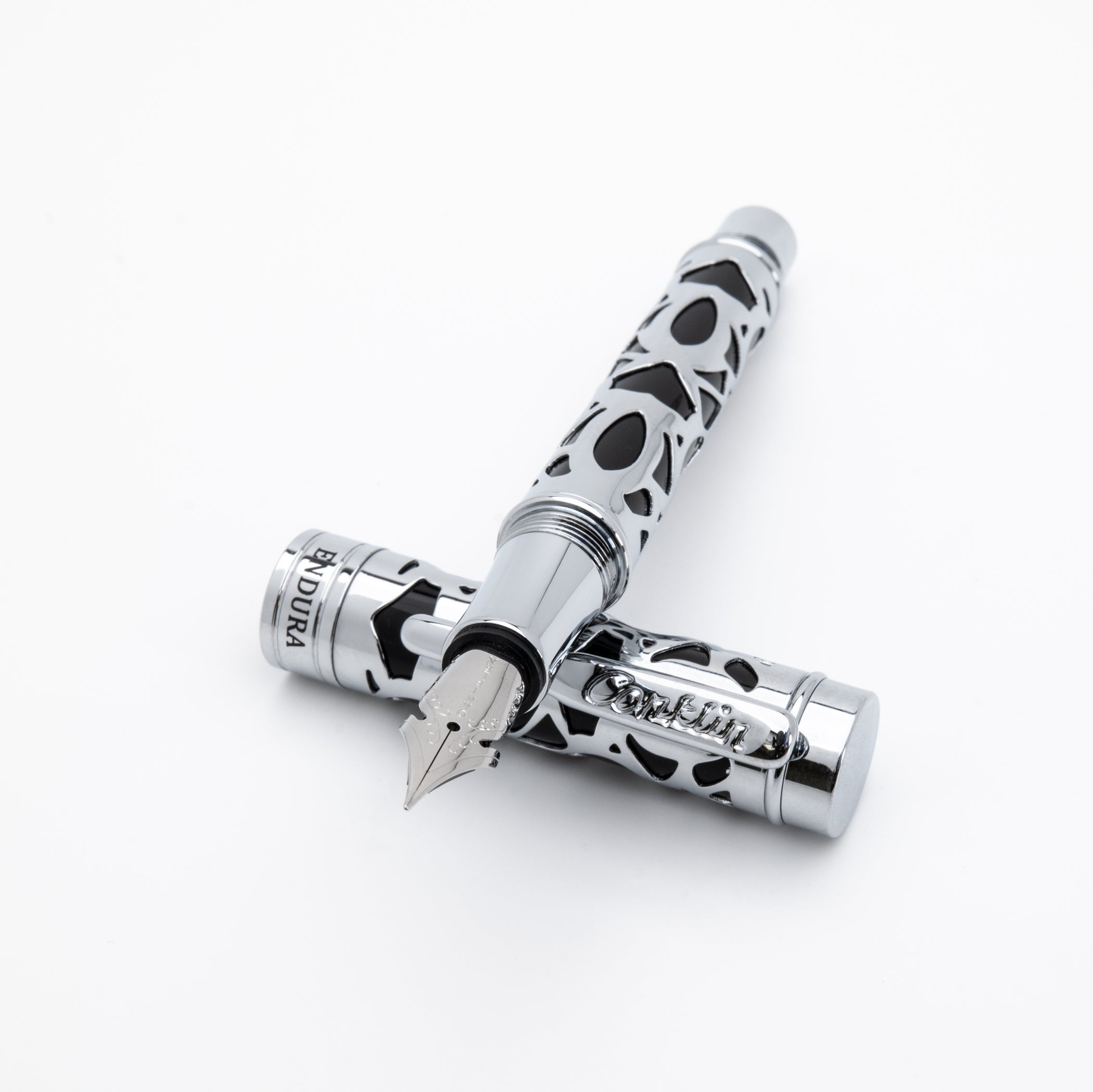 עט נובע מדגם Endura Deco Crest מבית Conklin, המשלב שניים מהעיצובים ההיסטוריים והמוערכים של המותג. גוף העט עשוי שרף אירופאי איכותי בעבודת יד בצבע שחור, ומשולב עיטור מתכת (Overlay) בגימור כרום מבריק. העט מצויד בציפורן פלדת אל-חלד מבית JoWo ומנגנון מילוי כפול, המאפשר שימוש במחסניות דיו או בממיר בוכנתי (כלול). זהו מכשיר כתיבה המשלב אסתטיקה קלאסית של תקופת ה-Deco עם חומרים וטכנולוגיה מודרניים, ומתאים לאספנים ולחובבי כתיבה יוקרתית.