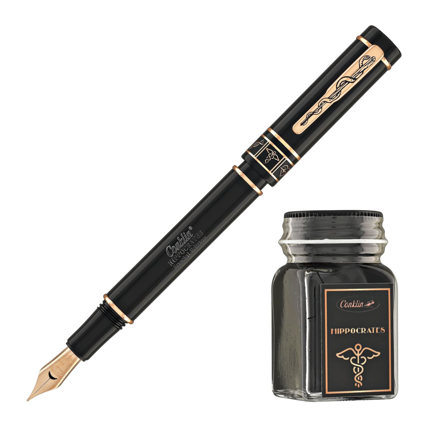 עט נובע מבית Conklin, מסדרת Hippocrates, כמחווה להיפוקרטס, "אבי הרפואה המערבית". גוף העט עשוי שרף (resin) אירופאי שחור, והוא מעוטר באלמנטים מצופים זהב ורוד 18 קראט המציגים סמלים רפואיים אייקוניים. העט מצויד בציפורן JoWo גרמנית איכותית מפלדת אל-חלד, ומגיע במגוון רחב של מידות עובי להתאמה אישית. מנגנון המילוי הינו משולב (מחסנית/ממיר), והוא מהווה מתנה אידיאלית לאנשי מקצוע בתחום הבריאות, לאספנים או כמתנה יוקרתית. העט מגיע במארז מתנה מהודר הכולל בקבוק דיו תואם.